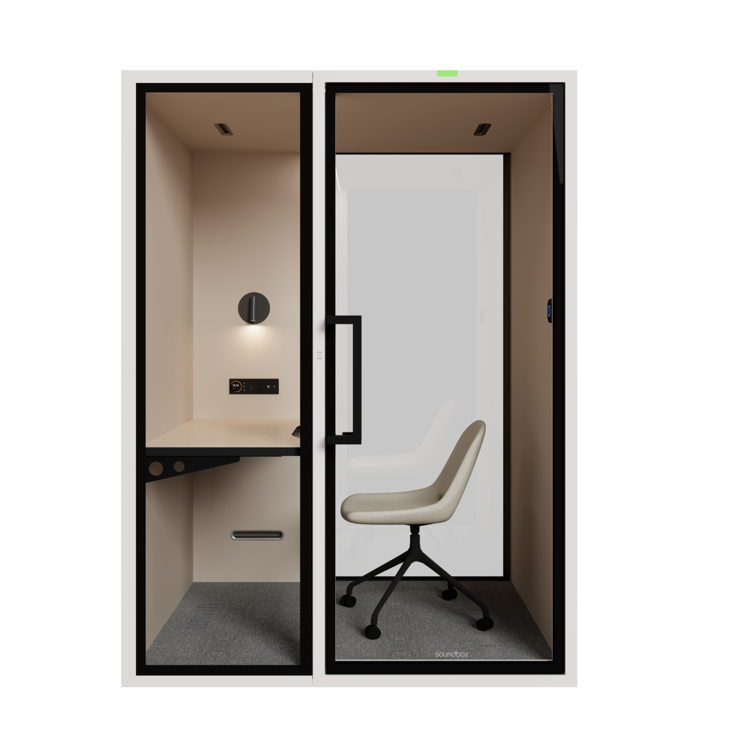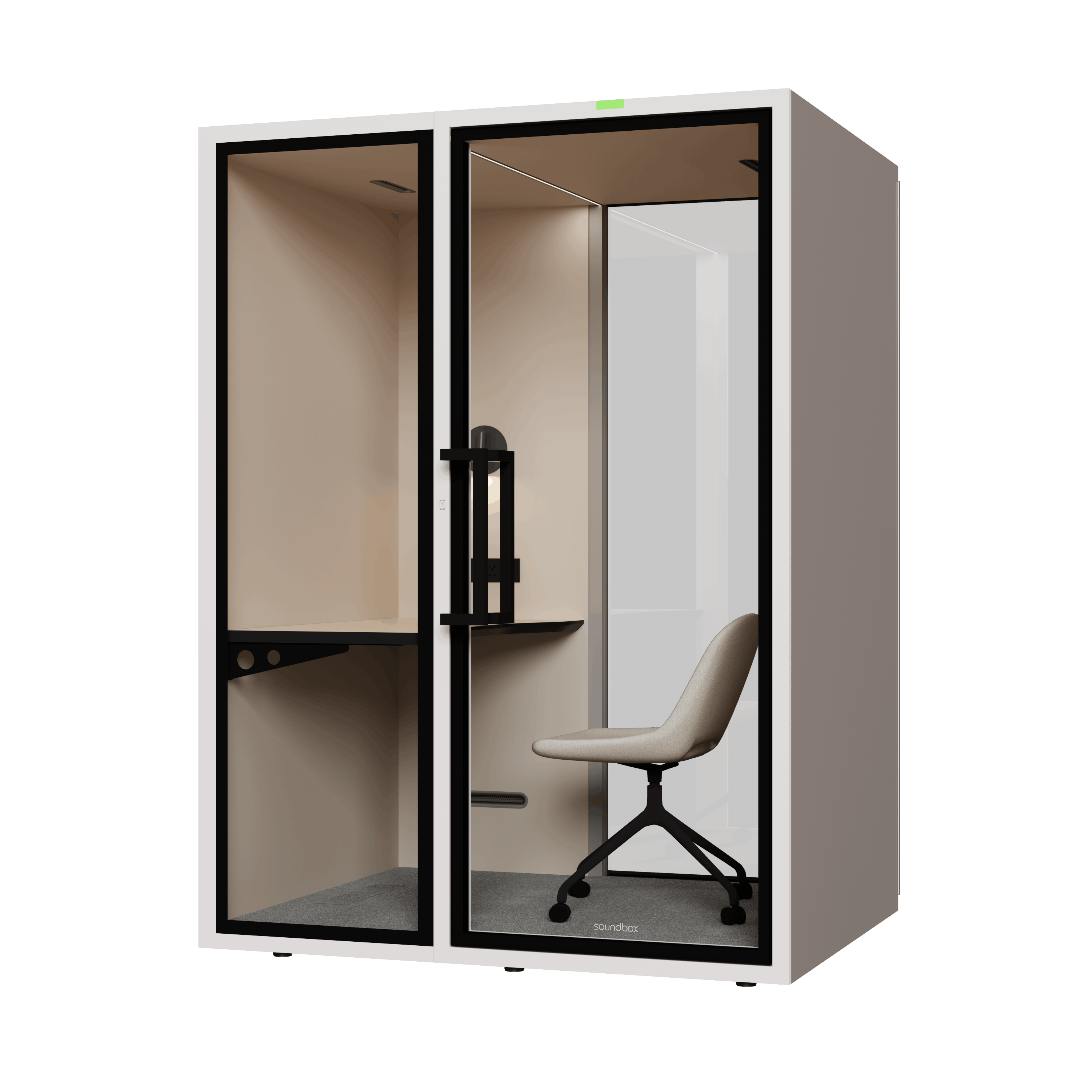 De ART Space wordt geleverd met een stoel en werkblad, ergonomisch ontworpen voor korte calls, focusmomenten en videogesprekken.